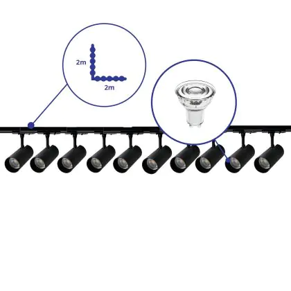 Description Ensemble complet Rail Monophasé Rail L 2 x 2 Mètre Noir | incl. 10x Spot + GU10 2700K 3W Dimmable + Embout, Connecteur d’Alimentation et L -Connecteur