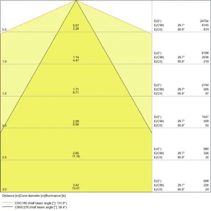 Le code couleur se compose de l'indice de rendu des couleurs (IRC) et de la température de couleur (Kelvin). Le premier chiffre indique le rendu des couleurs (1 = très mauvais rendu des couleurs, 9 = meilleure authenticité des couleurs). Le deuxième et troisième chiffre indiquent la température de la couleur. Exemple : Le code couleur "830" indique que la lampe a un bon rendu des couleurs (8) et une couleur de lumière blanche chaude (30 = 3000K). |