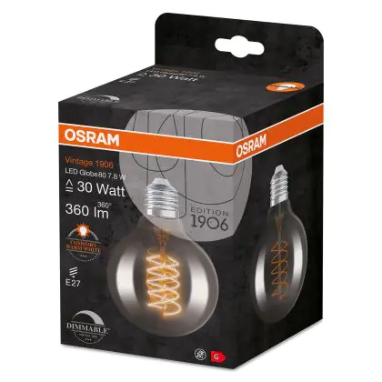 Description Osram Vintage 1906 LED E27 Globe Filament Smokey 80mm 7.8W 360lm - 818 Extra Warm White | Dimmable
