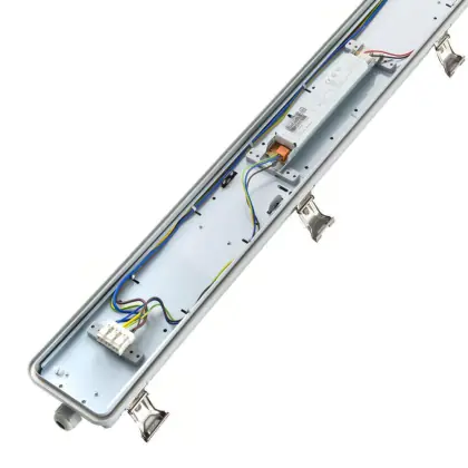 La réglette LED, Réglette LED Étanche 2650lm - 840 | 120cm - Dali Dimmable - Câblage Traversant (5x2.5mm2) est conçue pour remplacer les réglettes TL-D traditionnelles et permettant d’économiser jusqu’à 50% d’énergie. Très souvent utilisé pour l’éclairage d’entrepôts, d’usines, de parking et d’autres grands espaces extérieurs. Très simple d’installation, cette réglette de 120cm peut se fixer au plafond et au mur et projette 4000K - Blanc Froid, comme couleur de lumière. La Réglette LED Étanche 2650lm - 840 | 120cm - Dali Dimmable - Câblage Traversant (5x2.5mm2) dispose d’un indice de protection IP66 à l’eau et la poussière et d’une résistance aux chocs IK08.